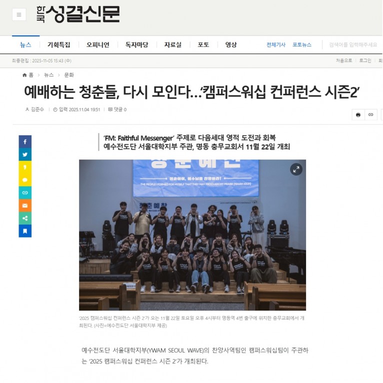 예수전도단 서울대학지부(YWAM SEOUL WAVE)의 찬양사역팀인 캠퍼스워십팀이 주관하는 ‘2025 캠퍼스워십 컨퍼런스 시즌 2’가 개최된다.