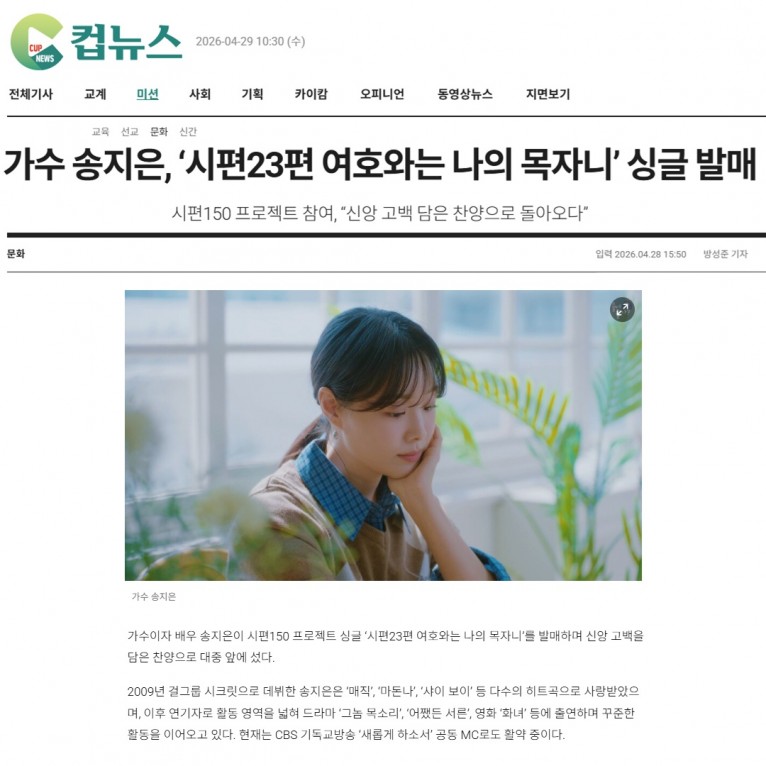 [기사] 가수 송지은, ‘시편23편 여호와는 나의 목자니’ 싱글 발매(크리스챤연합신문 컵뉴스)
